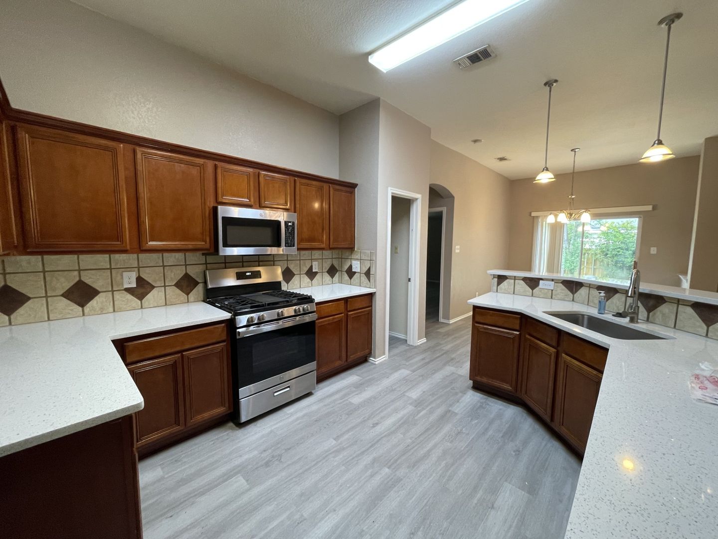 This beautiful 4 bedroom 2 bathroom home is located close to shopping, dinning and all major highways. The home is a open split concept floorplan offering luxury vinal plank flooring throughout the house. 2 Large living rooms Kitchen counter tops are quartz with a sit up breakfast bar. Large pantry. Gas range, microwave and dishwasher. Master bedroom offers a spacious bathroom with a garden tub and separate shower, large walk in closet.